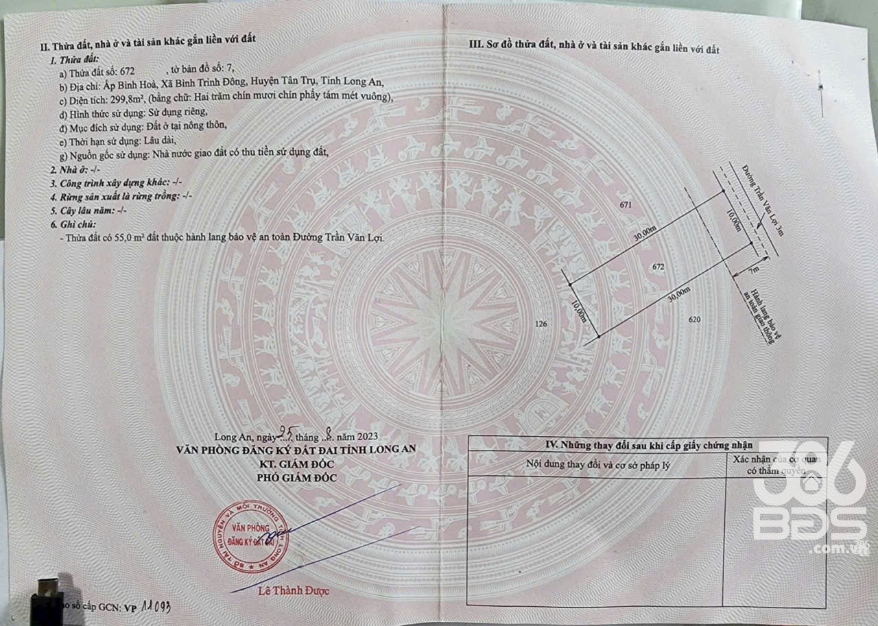 Bán đất thổ cư mt đường beton Trần Văn Lợi , xã Bình Trinh Đông , Tân Trụ dt 150m2 giá 590 triệu